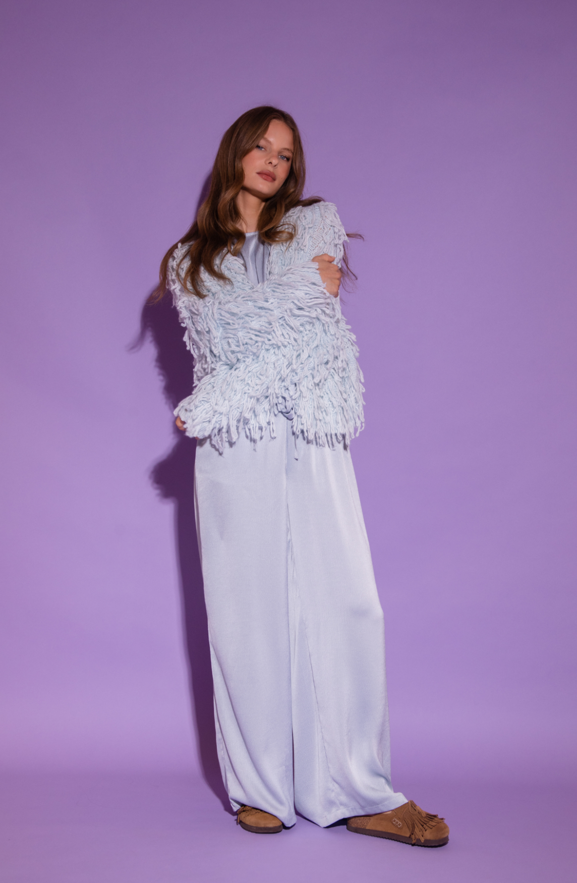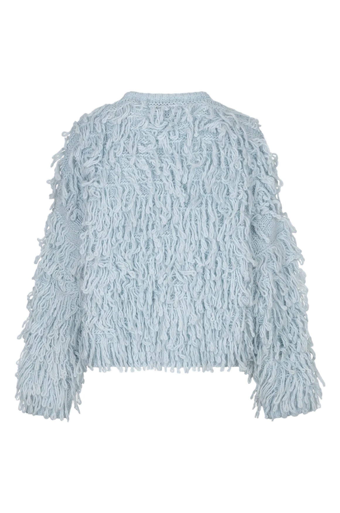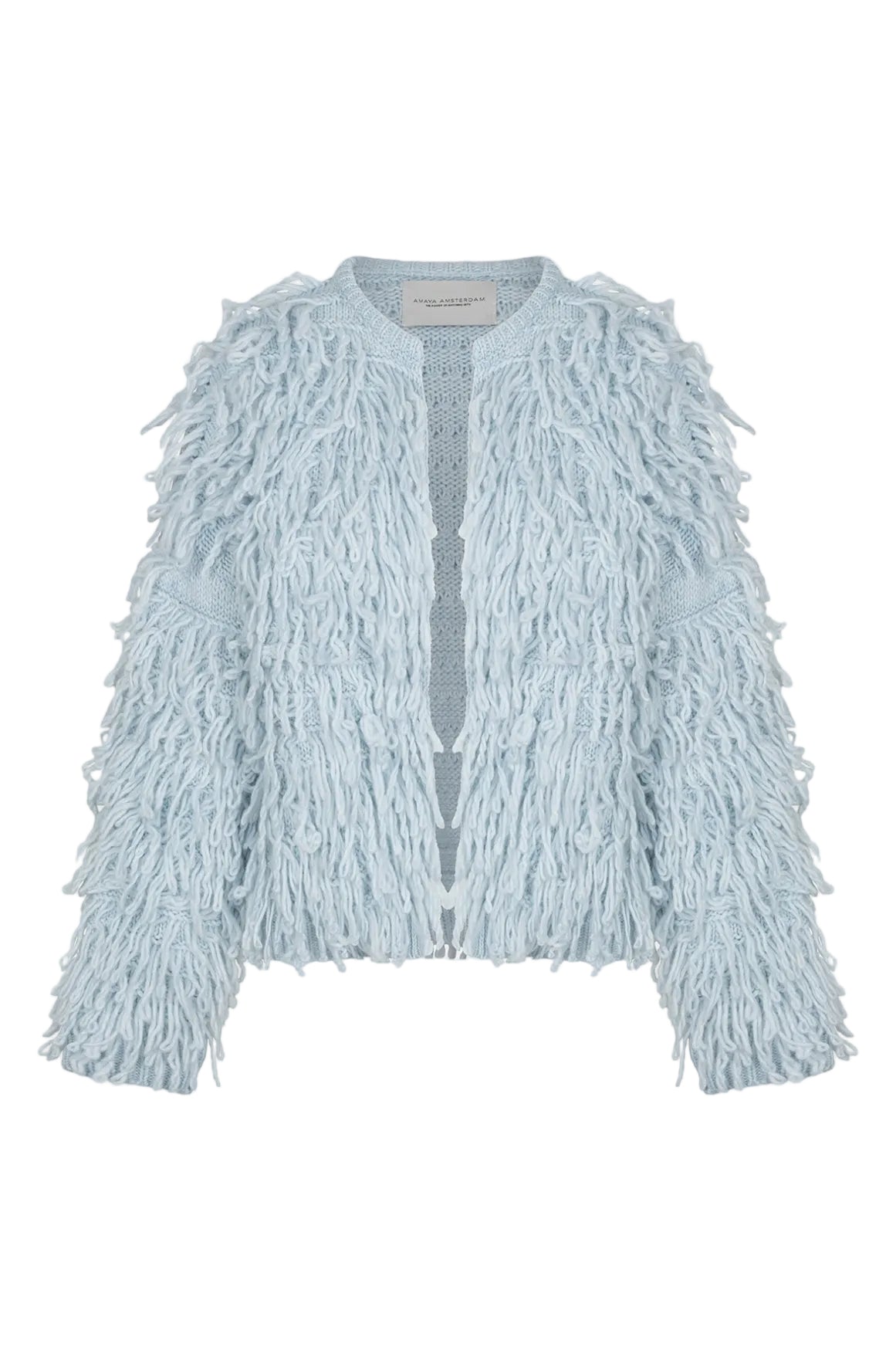 De Dolce Cardigan van Amaya Amsterdam is een echte eyecatcher. Dit statement vest in een zachte lichtblauwe tint combineert comfort met een uitgesproken, stijlvolle uitstraling. De rijke structuur met lange, speelse franjes geeft het vest een luxe en moderne bohemian touch.