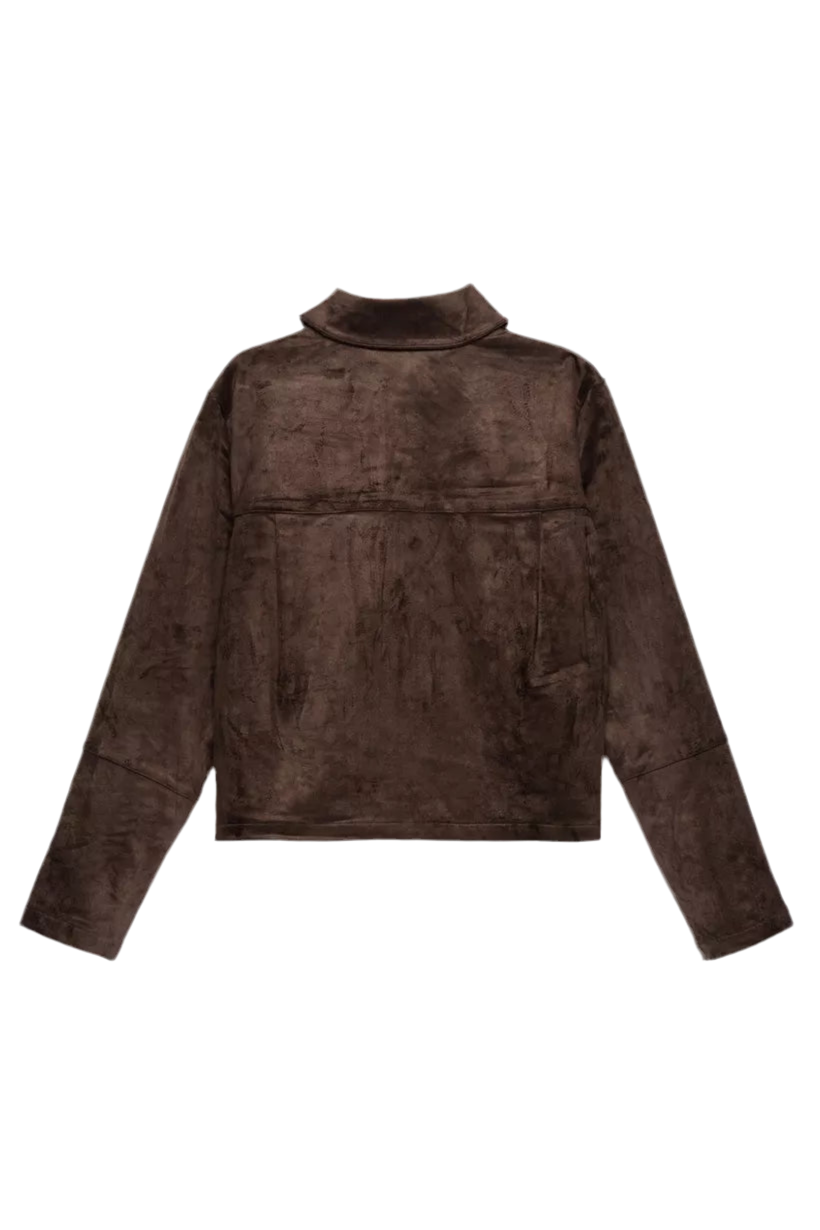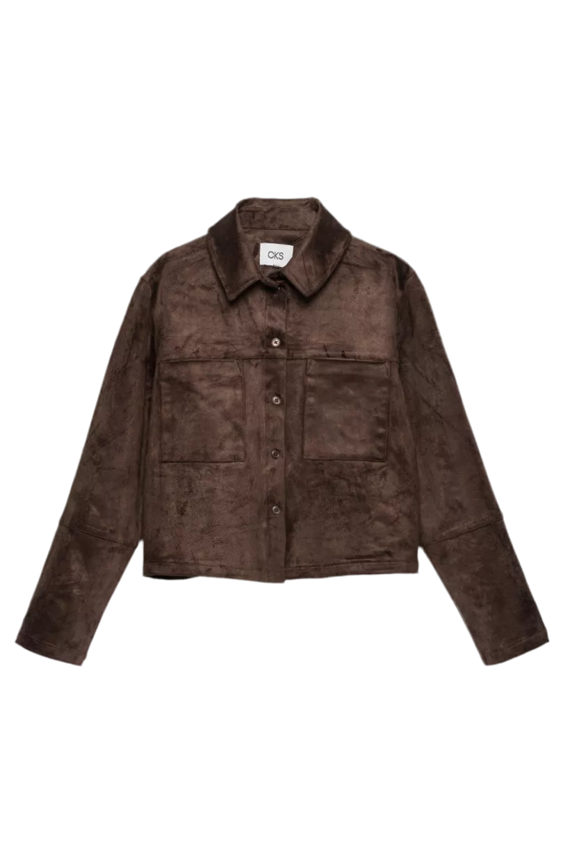 Twee trends in één item! 🤎 Deze korte jas van suèdelook in een diepe chocoladebruine tint is dé must-have van dit seizoen. De zachte, luxe stof en warme kleur maken hem perfect voor de herfst en winter. De jas heeft een stijlvolle hemdkraag, opvallende zakken en een knoopsluiting voor een stoere maar elegante uitstraling.