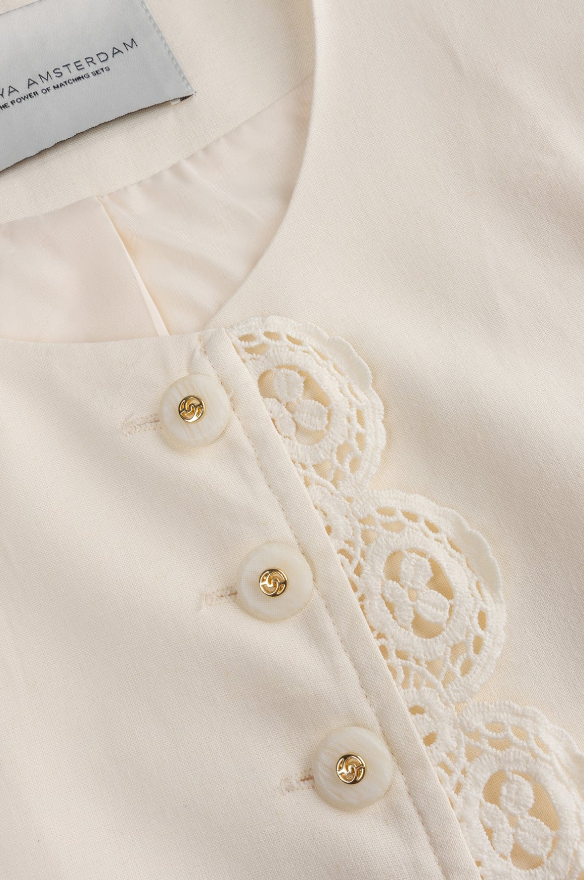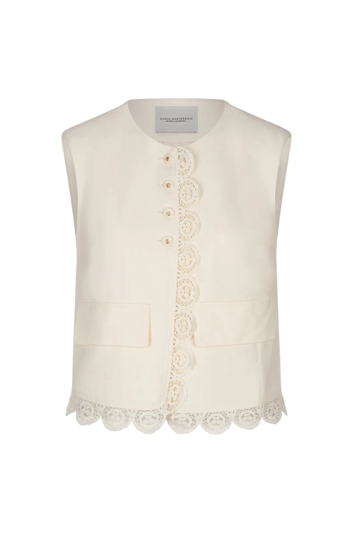 Het Luma Gilet van Amaya Amsterdam straalt pure verfijning uit. Dit mouwloze gilet in een zachte beige tint combineert een natuurlijke viscose-linnen blend met romantische details voor een elegante, vrouwelijke look.