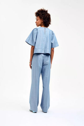 Steel de show met deze lichtblauwe denim blouse! De zilveren glans en speelse korte mouwen geven deze blouse een feestelijke touch, terwijl het A-lijn silhouet zorgt voor een flatterende pasvorm. Combineer met de bijpassende broek voor een stijlvolle co-ord set of draag ‘m met je favoriete jeans voor een trendy denim-on-denim look.