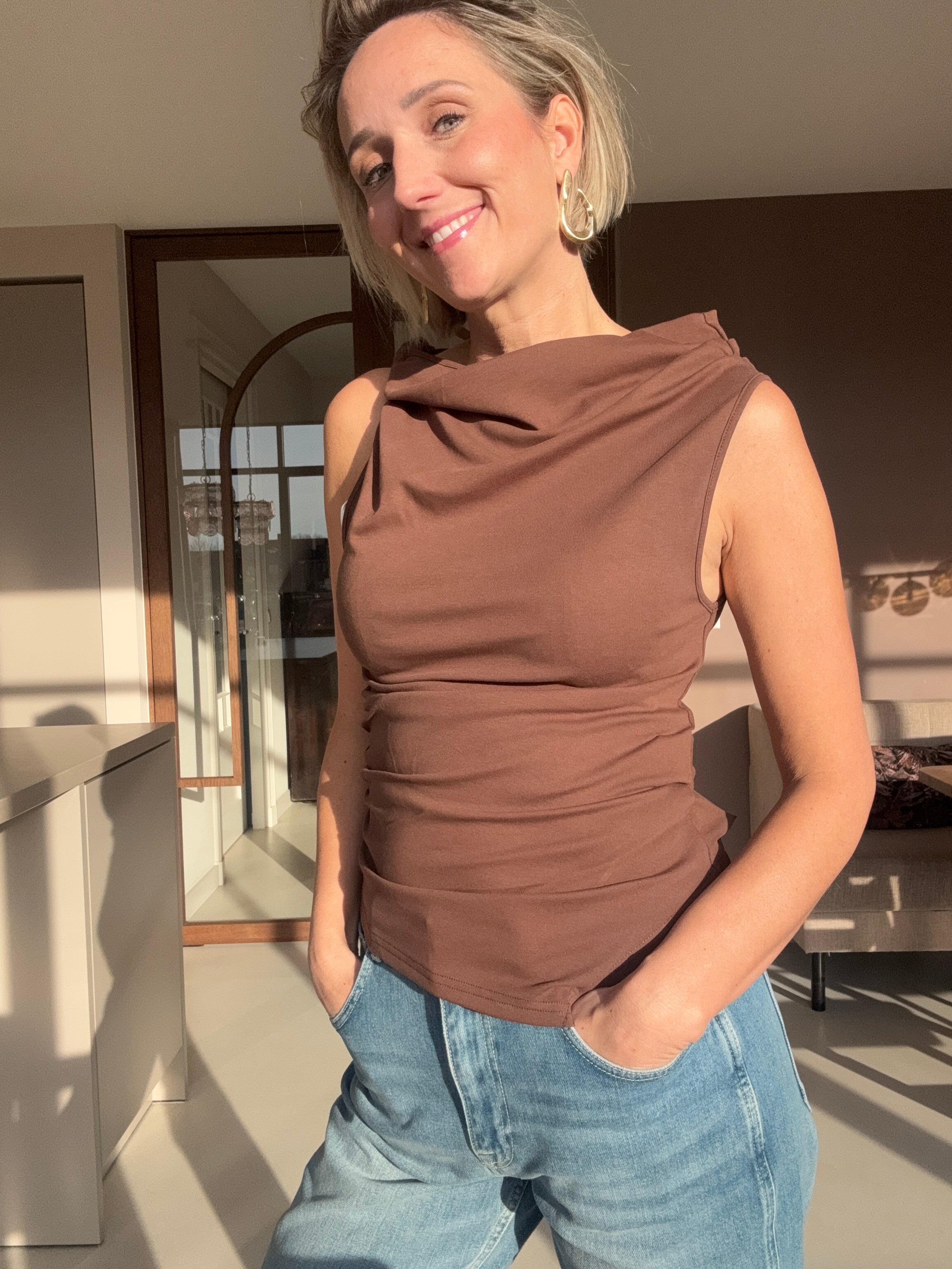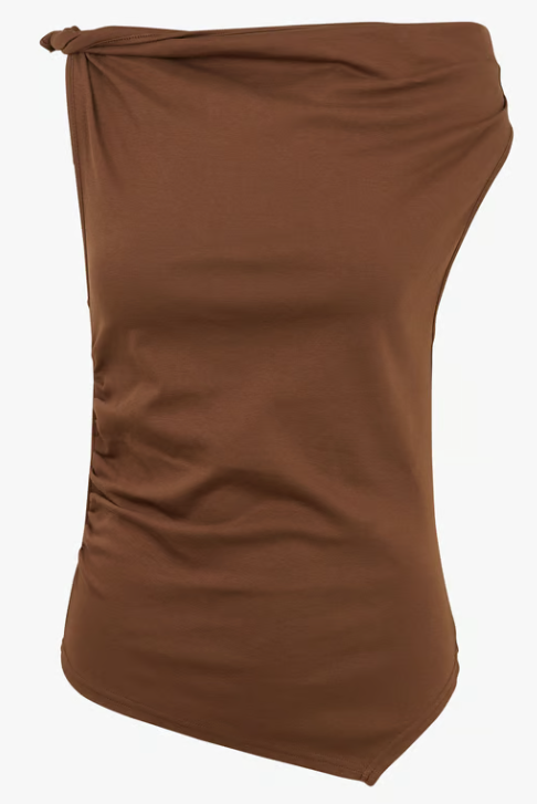 De Choco Sleeveless Knotted Top is een stijlvolle en eigentijdse top in een warme chocoladebruine tint. Het mouwloze ontwerp zorgt voor een luchtige en vrouwelijke uitstraling, perfect voor zowel casual als geklede looks.