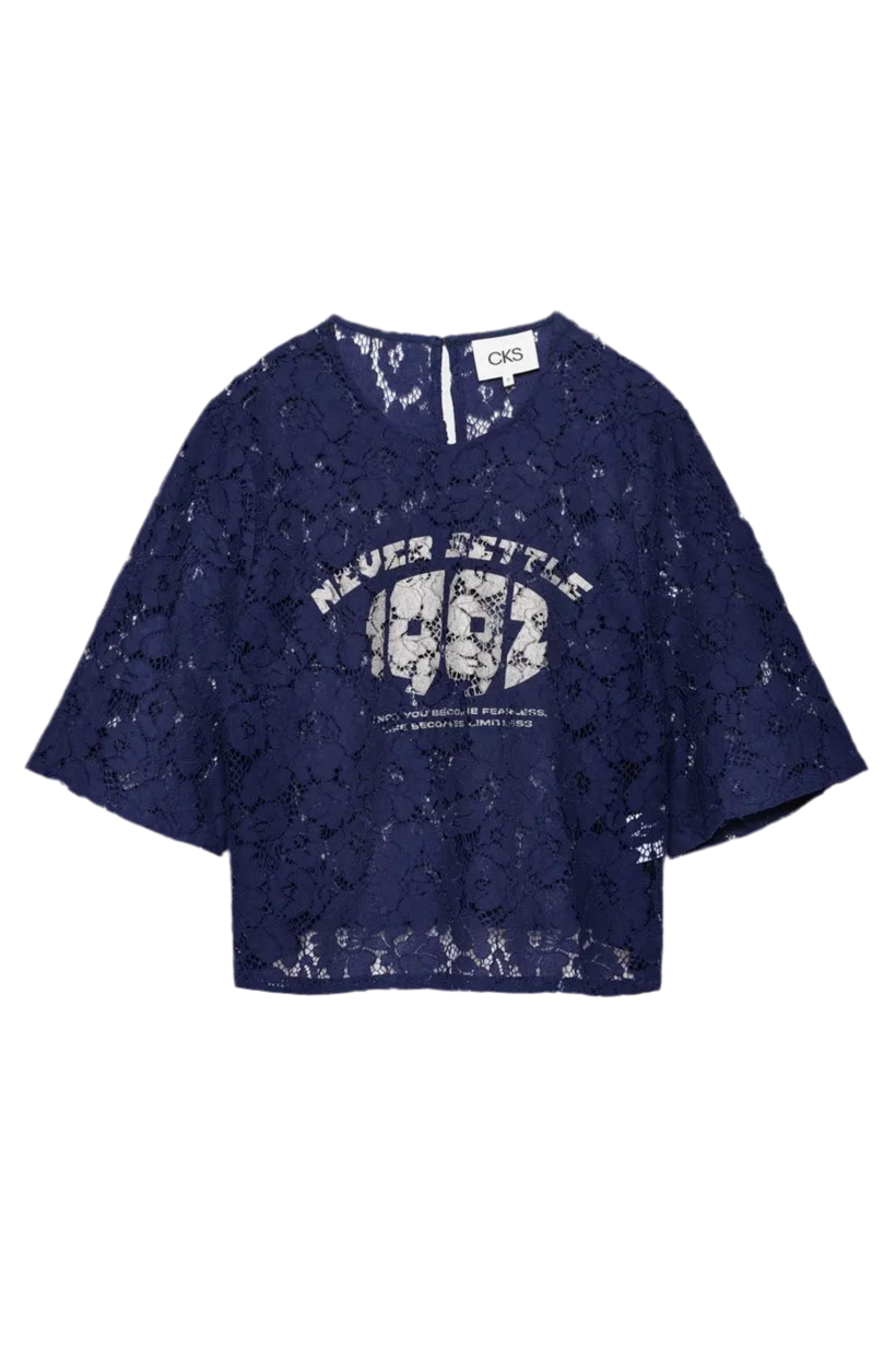 Deze navy kanten top van CKS is een echte eyecatcher en tilt elke outfit direct naar een hoger niveau. Het see-through kant in combinatie met de opvallende 1992-print op de voorkant zorgt voor een unieke mix van sporty en chic. De verfijnde lace structuur geeft de top een speelse twist, terwijl de ronde hals en driekwartmouwen zorgen voor een comfortabele, stijlvolle fit.