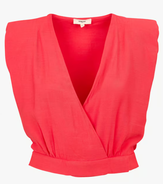 De mouwloze crop top met V-hals van SUNCOO is een elegante en moderne damestop die stijl en comfort combineert. Dankzij de rechte snit en de verfijnde details is dit een veelzijdig stuk dat zowel casual als gekleed gedragen kan worden.