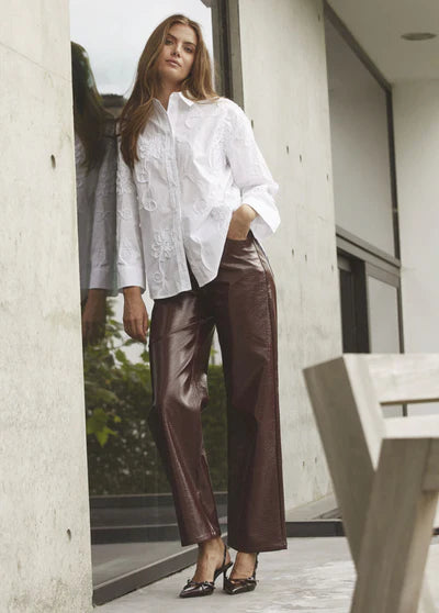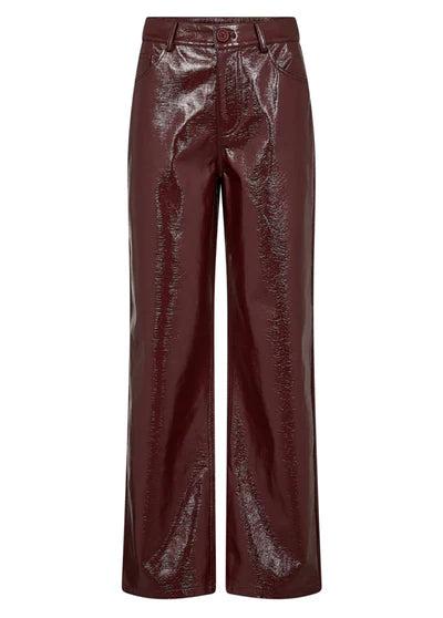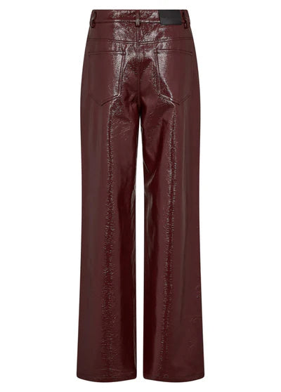 De PosyCC LL Pant van Co'Couture is een echte eyecatcher voor dit seizoen. Deze stijlvolle pantalon is uitgevoerd in een chique wijnrode kleur met een subtiele glans en een leatherlook finish. Het losvallende model met high waist geeft je outfit een moderne en elegante uitstraling, terwijl de langere fit zorgt voor een mooi, slank silhouet.