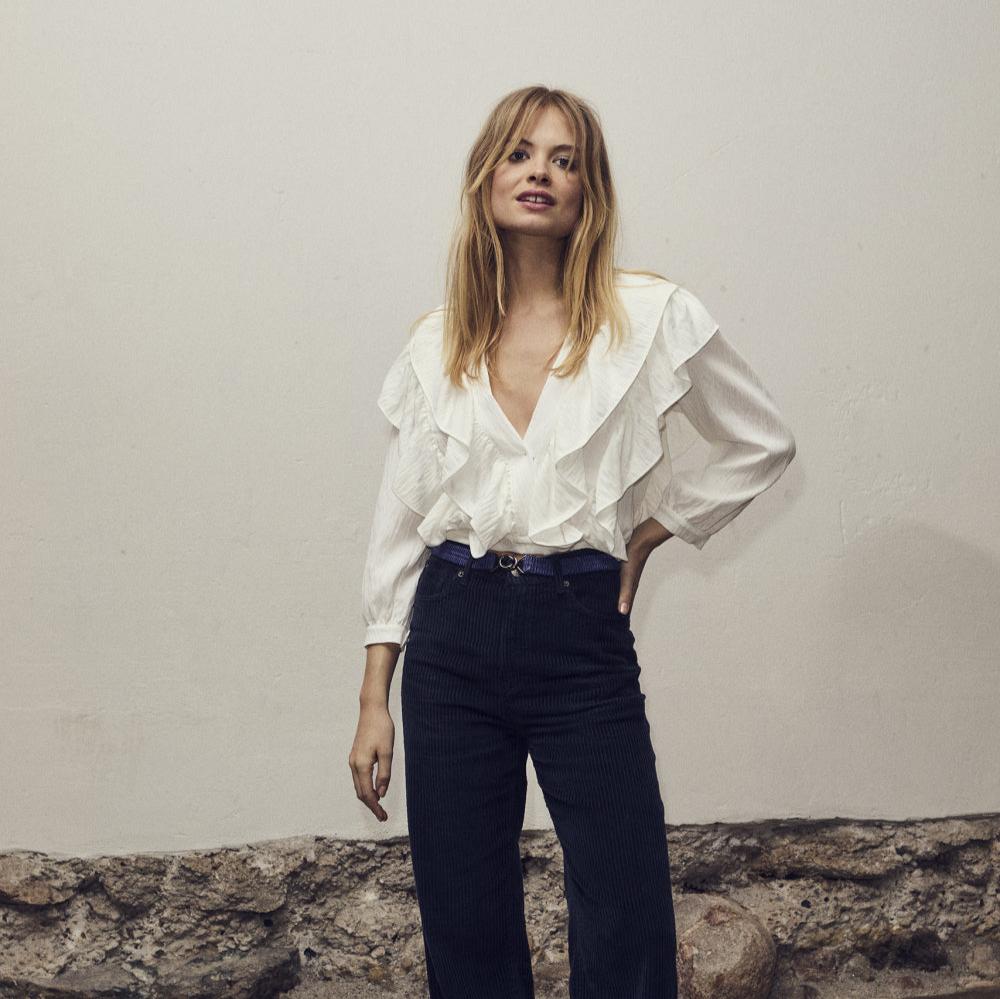 De SuedaCC Frilly Blouse - White is een elegante toevoeging aan je garderobe, ontworpen om je stijl naar een hoger niveau te tillen. Deze prachtige blouse biedt veelzijdige stylingopties door de mooie decolleté, of je nu kiest voor een plak BH of een mooie top eronder. Perfect voor verschillende gelegenheden, van een chique diner tot een casual dagje uit.